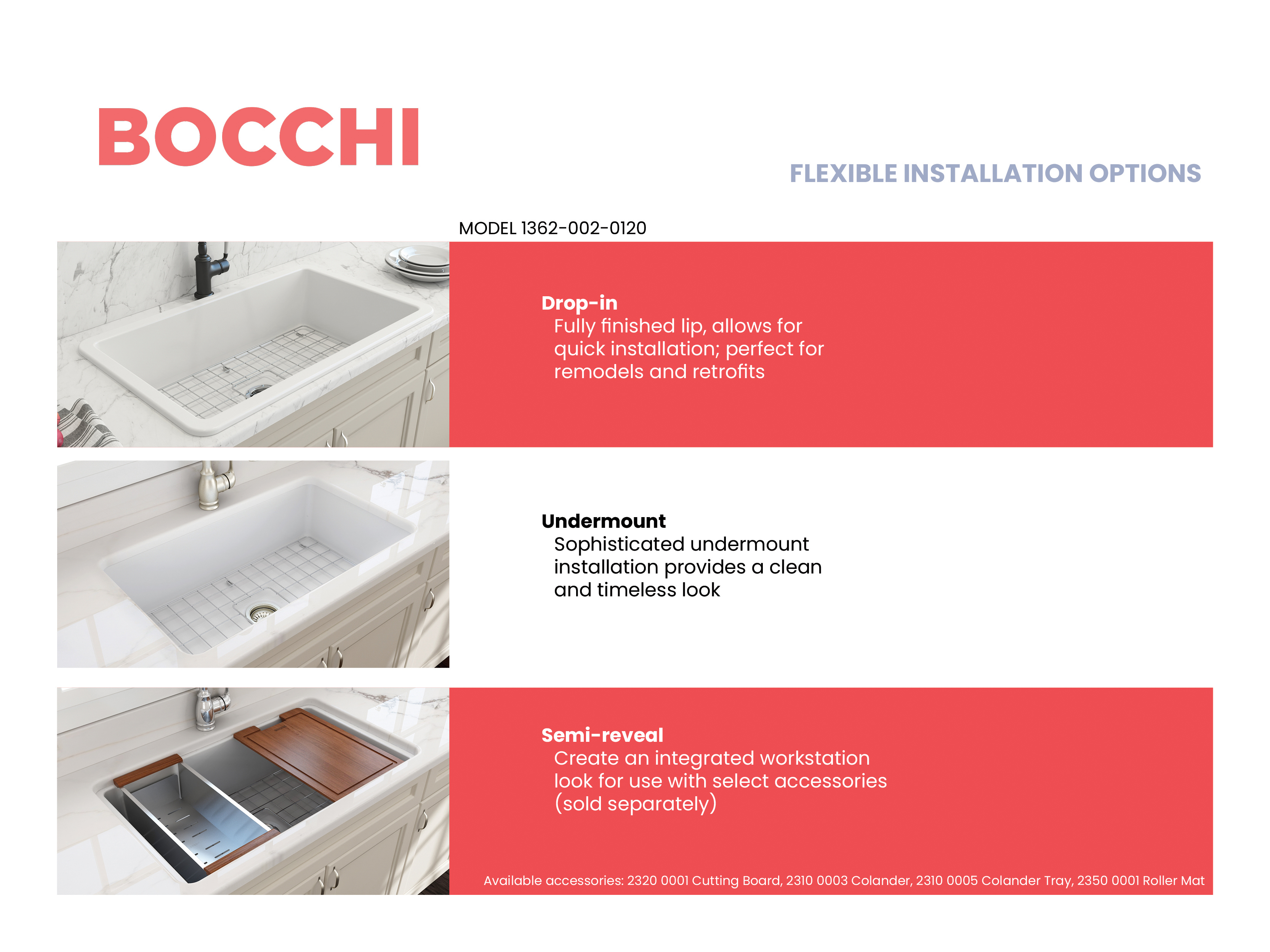 Uniquely crafted for to allow multiple installation types. May be installed as an undermount, drop-in, or with an 11/16” semi-reveal that creates a workstation sink ledge suitable for use with select accessories, including: cutting board, colanders, and roller mat. Note, the roller mat and expandable colander may also be used with the undermount and drop-in installations.