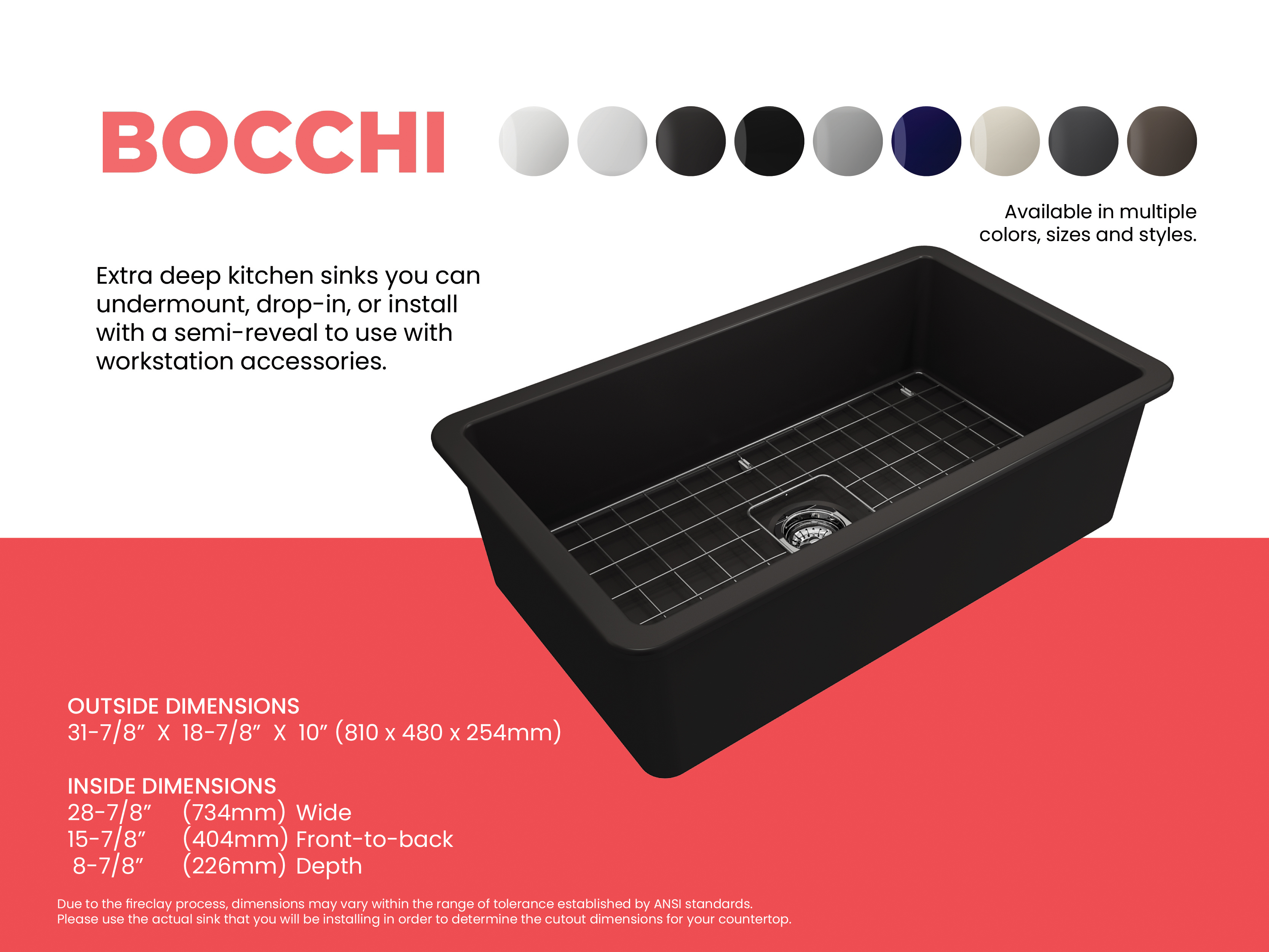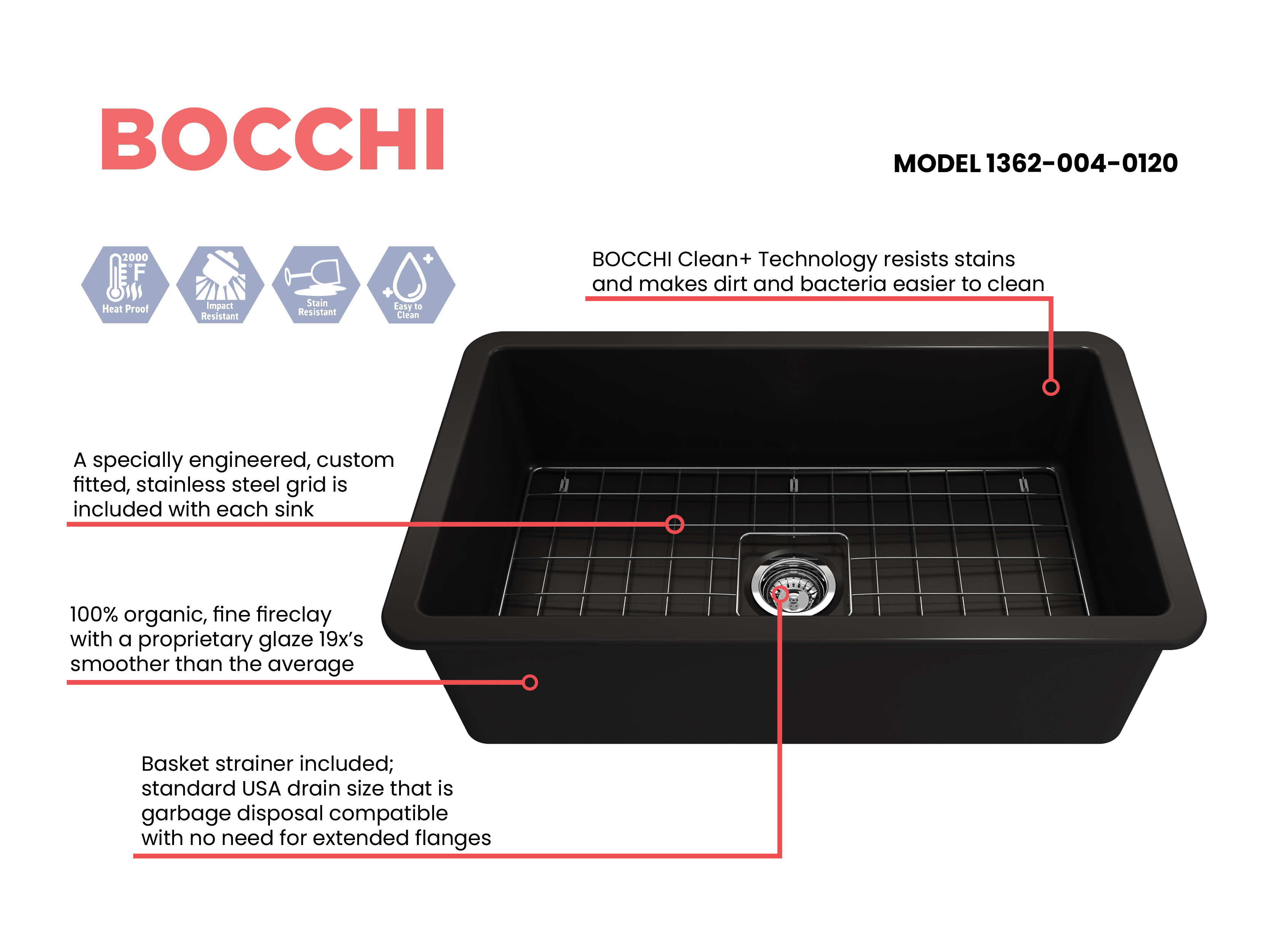 BOCCHI Sinks bring back the ultimate material to your kitchen. Fireclay, a 100% natural organic and recyclable material used by craftsman for centuries to create timeless appliances has now returned to your kitchen. With the firing in our kilns up to 2000°F temperatures, Fireclay becomes the most durable material used in today's kitchens. Thus, dealing with extreme heat coming from pots and pans is definitely not a problem. Due to their special glaze coating fused with the fireclay body, our sinks have a non-porous, uniform, scratch and stain resistant surface. With its protective bottom grid and distinctive looks, BOCCHI Sinks are truly crafted to match your design and functional desires.