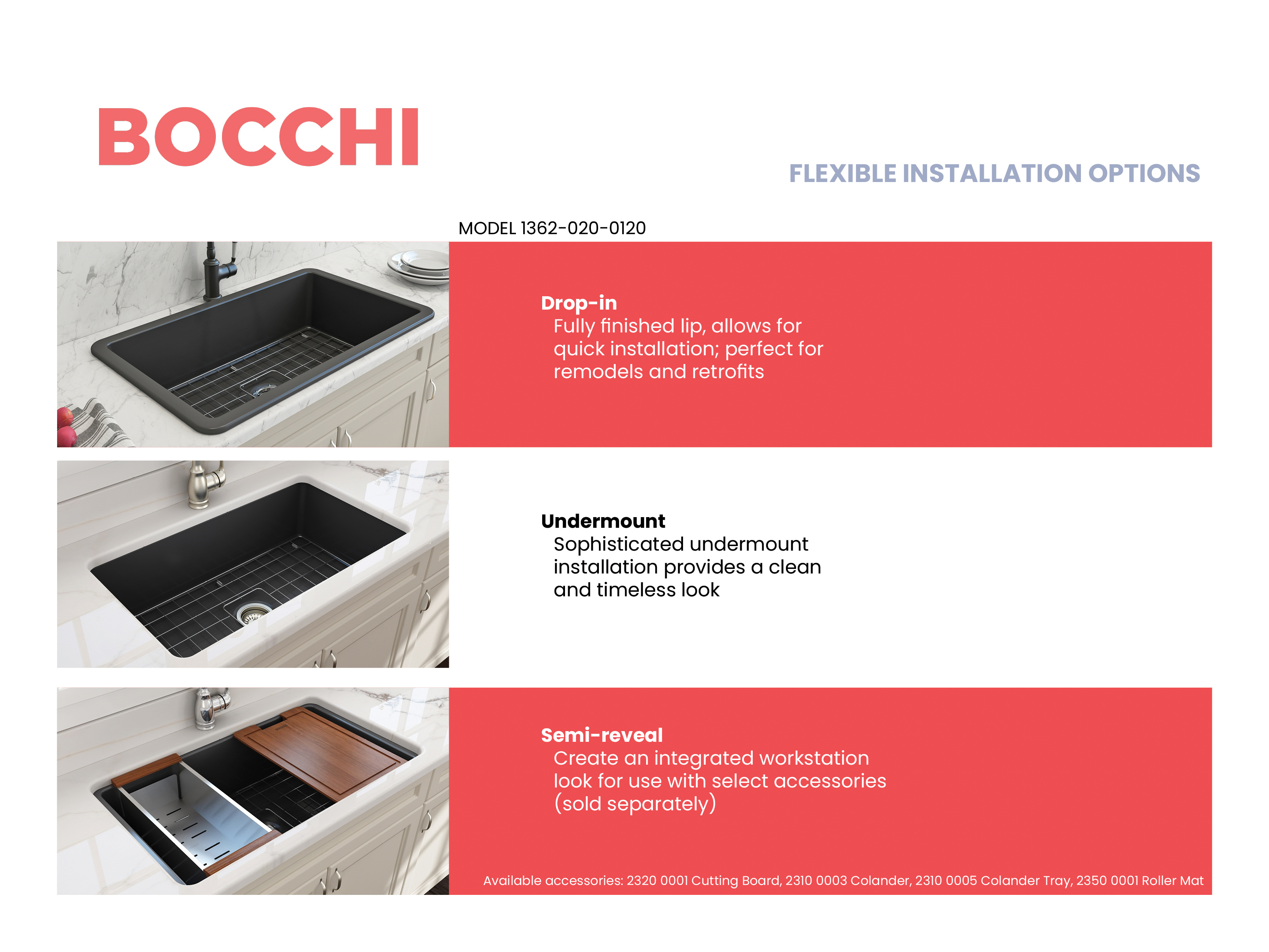 Uniquely crafted for to allow multiple installation types. May be installed as an undermount, drop-in, or with an 11/16” semi-reveal that creates a workstation sink ledge suitable for use with select accessories, including: cutting board, colanders, and roller mat. Note, the roller mat and expandable colander may also be used with the undermount and drop-in installations.