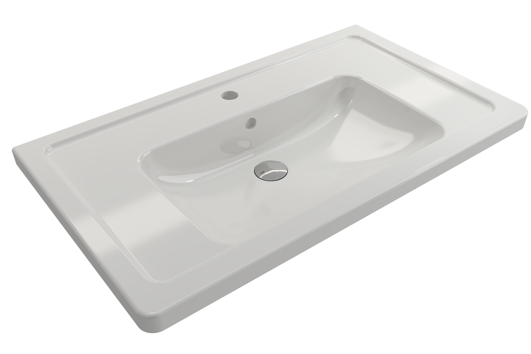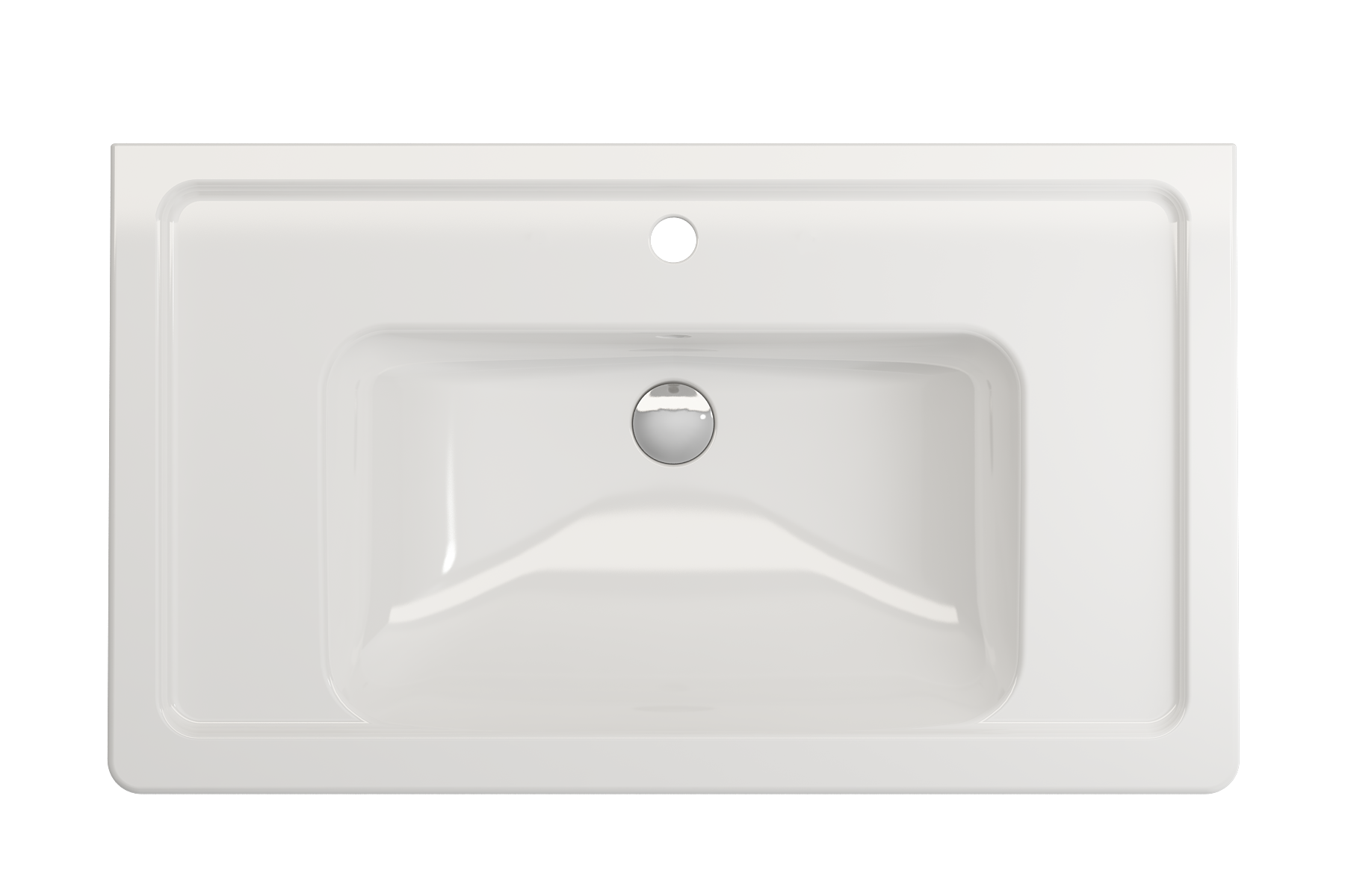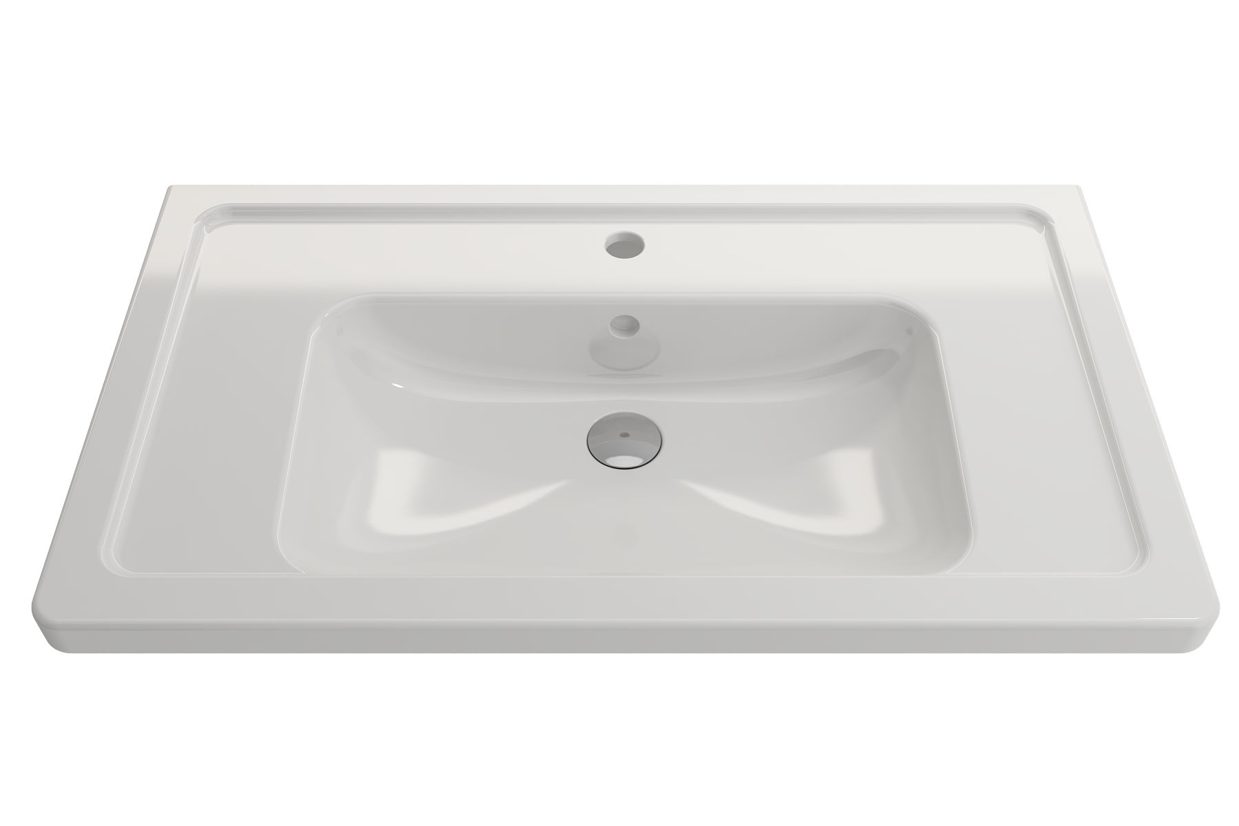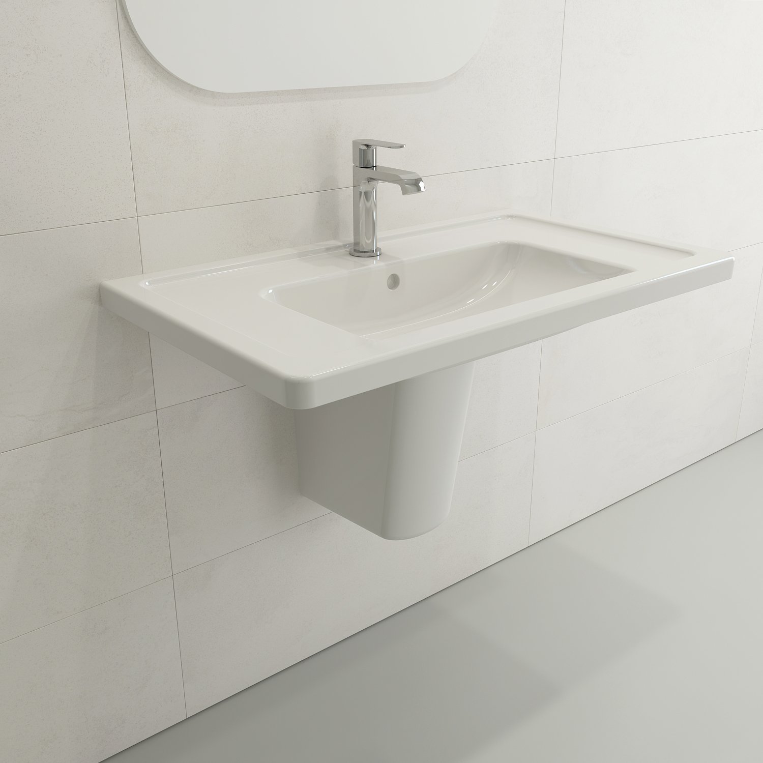 Classically styled pedestal sink top in fine fireclay. May be used with pedestal base, or trap cover. Single-hole faucet setting with overflow.