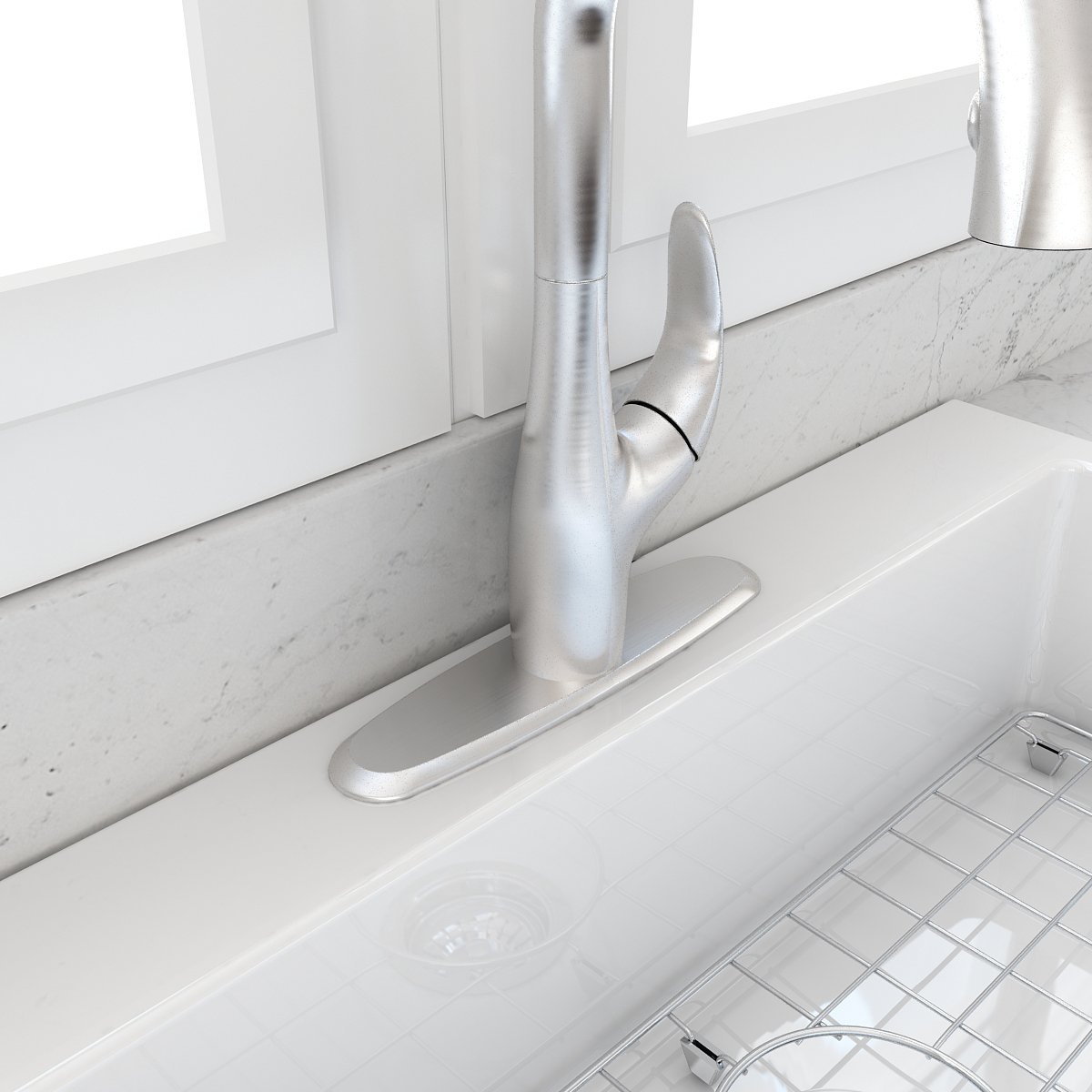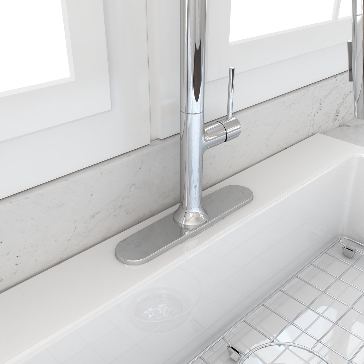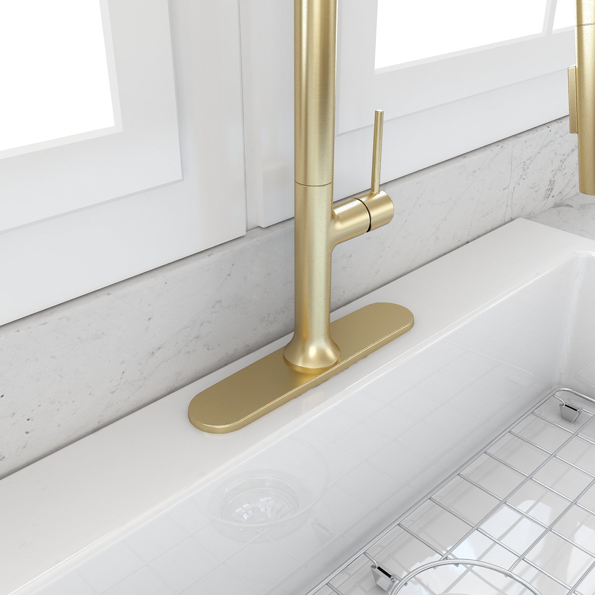 Brass deck plate (escutcheon) for single kitchen faucets. Features a universal design with a rounded, oval shape that compliments all faucet designs including traditional models.