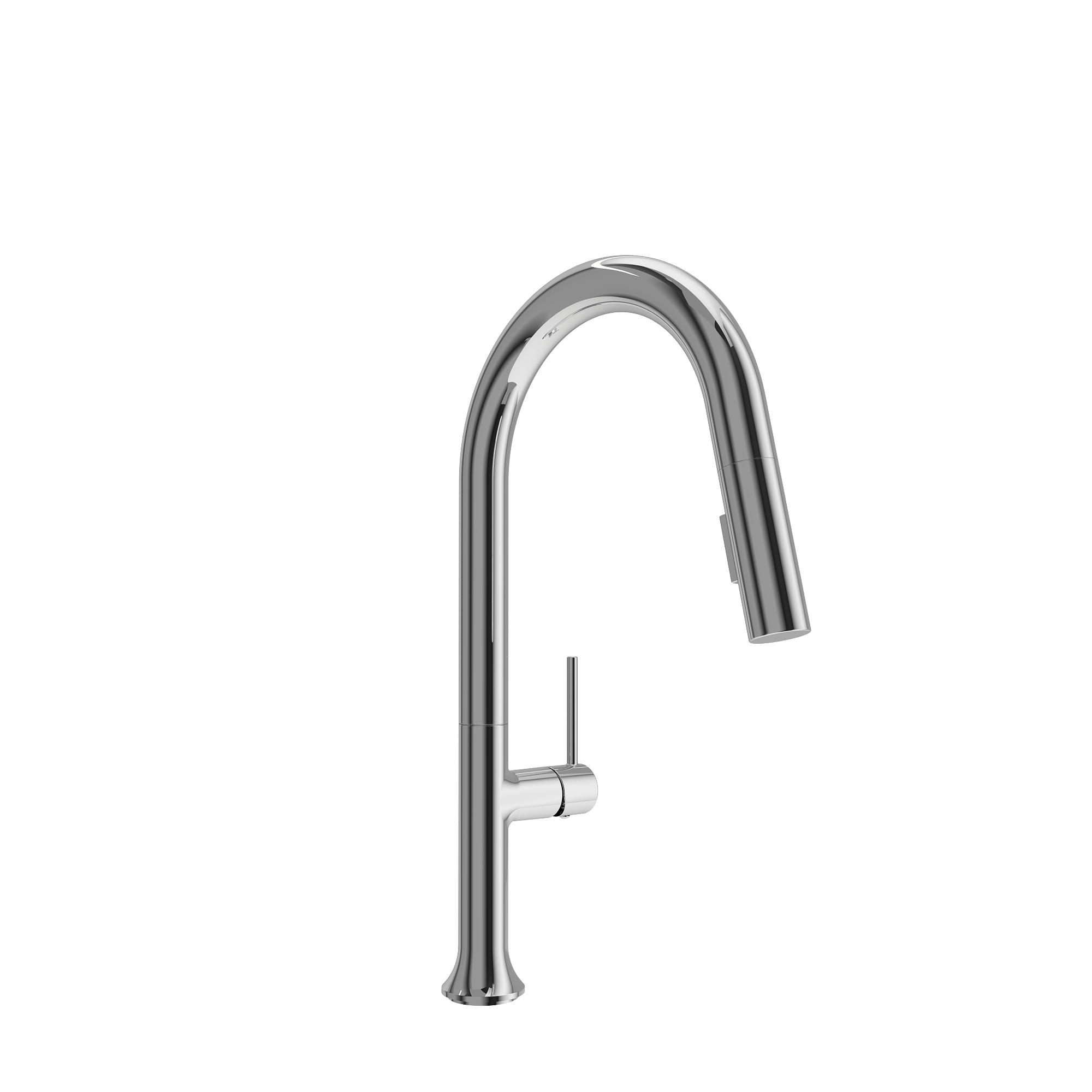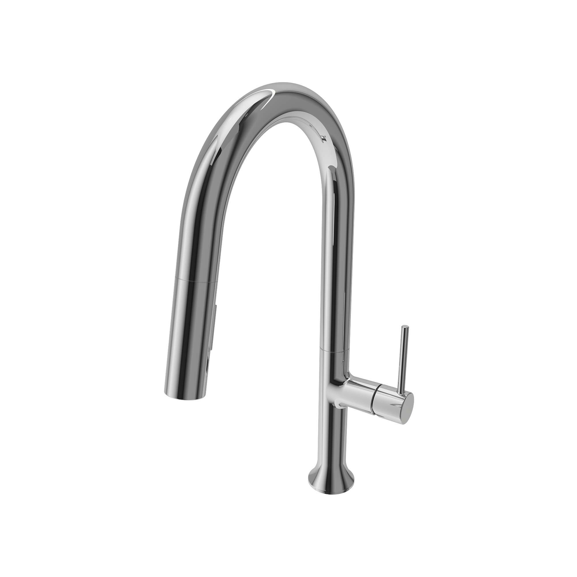 Pull-down kitchen faucet with ceramic cartridges and brass body. Features standard or needle spray with weighted shower hose.