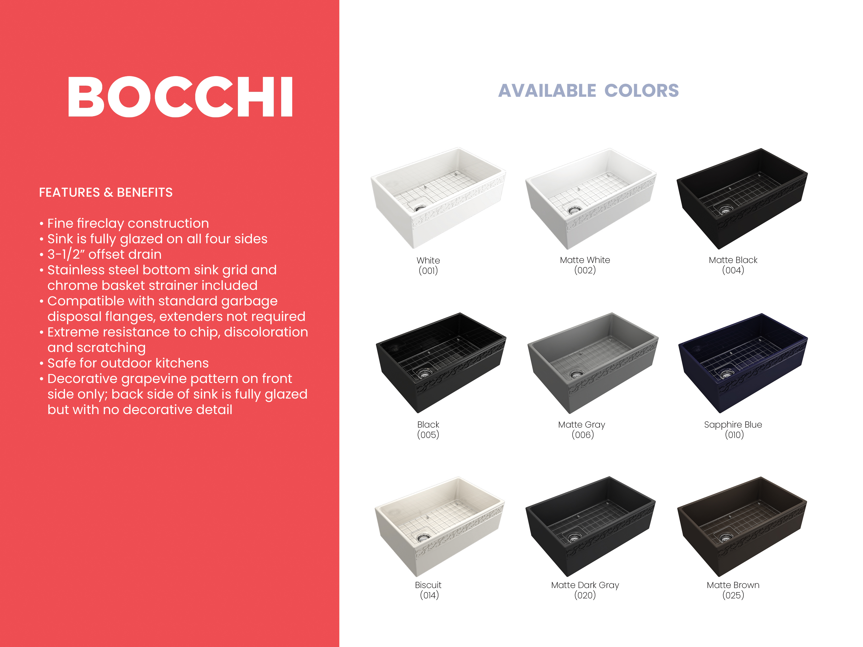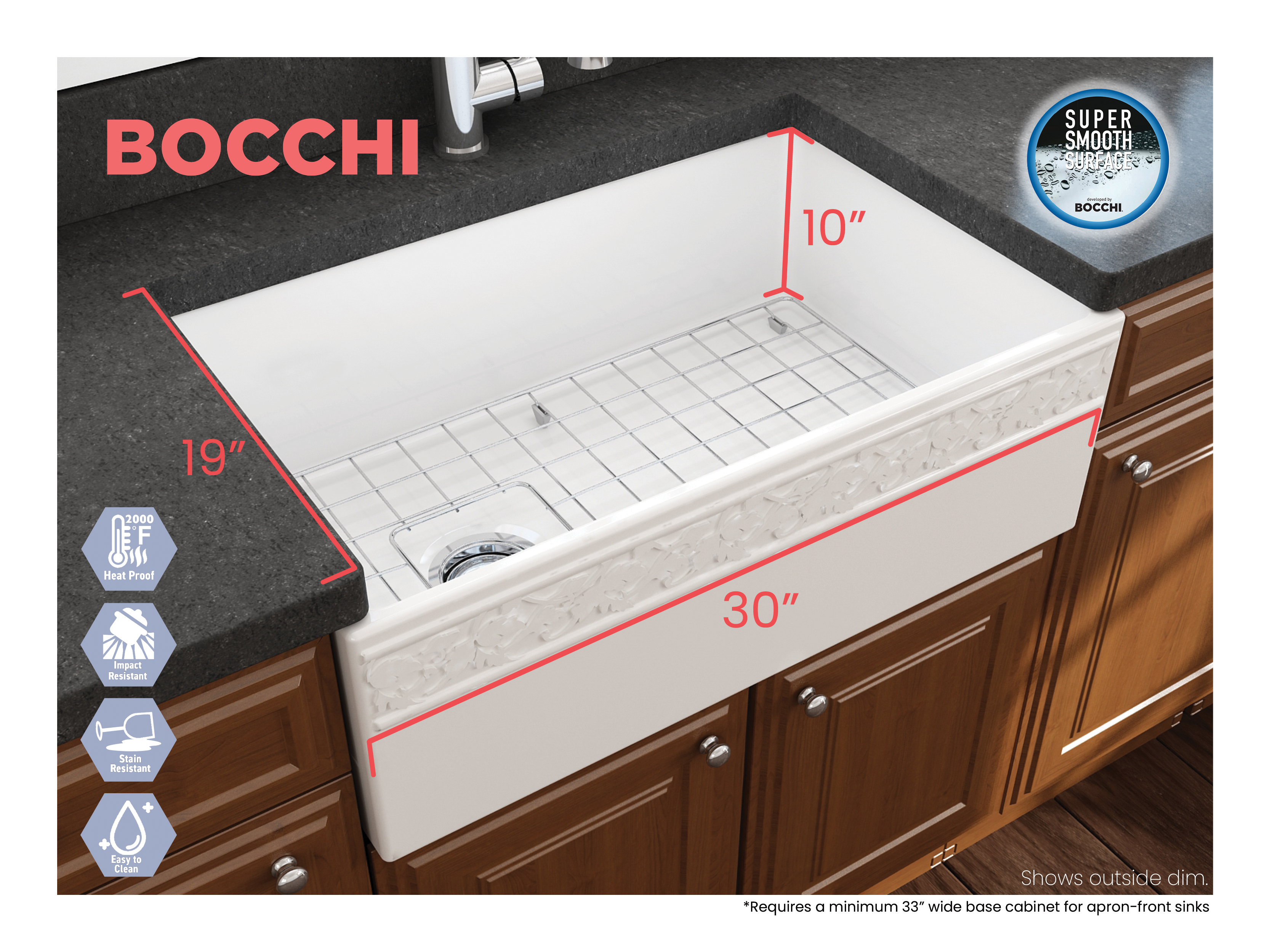 BOCCHI Farmhouse Sinks bring back the ultimate material to your kitchen. Fireclay, a 100% natural organic and recyclable material used by craftsman for centuries to create timeless appliances has now returned to your kitchen. With the firing in our kilns up to 2000°F temperatures, Fireclay becomes the most durable material used in today's kitchens. Thus, dealing with extreme heat coming from pots and pans is definitely not a problem. Due to their special glaze coating fused with the fireclay body, our sinks have a non-porous, uniform, scratch and stain resistant surface. With its protective bottom grid and distinctive looks, BOCCHI Farmhouse Sinks are truly crafted to match your design and functional desires.